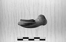 | Description: | Rim broken away, inside blackened by use. It has a bowl condensed to a very small disk, keel bottom, cup-like rim (now missing) and short stem socket with large swelling at stem end, ornamented with four rows of tiny indentations. Seal on right side of stem, under bowl. Light brown clay and slip, well burnished. | |