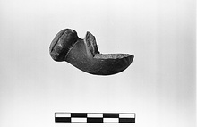 | Description: | Rim. Most of bowl and about one third of stem socket broken away. Round pipe with keel bottom, short stem socket with medium hole. Moulded decoration of petals on stem socket, slanting grooves on bowl. One band of rouletting around stem socket. Dark orange-brown clay and red-brown slip. | |