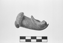| Description: | Rim and most of bowl missing. Lily shaped pipe with faceted bowl. Plain stem socket with wide rim, indicated arcs on end. Stamped decoration on facets. Seal on side of socket. Light red clay, red slip. | |