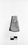 | Description: | Intact, but chipped. Rather crudely formed pyramidal. It has a single, roughly elliptical, suspension hole. Surfaces crudely smoothed. | |