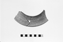 | Description: | One quarter preserved; broken at both ends. Mended from six fragments. Concave wall. Light buff slip. Reddish-brown glaze on both sides. Very fine, hard, reddish clay. | |