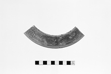 | Description: | One quarter preserved; broken at both ends. Mended from two fragments. Inscribed. Straight wall. On the outer side the letter "A" is inscribed before firing. Buff slip. Worn black glaze on both sides. Very fine, hard, reddish clay. | |