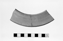 Straight wall. Light greenish-buff slip on both sides. Traces of black glaze on the inner edge.