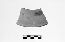 | Description: | Small section preserved; broken at both ends. Mended from two fragments. Straight wall. Light buff slip on inside, orange on outer part of base. Traces of red glaze on inner edge. Very fine, hard, reddish clay. | |