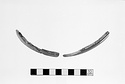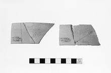 | Description: | Two non-joining fragments broken at both ends. Both mended from three fragments. Straight vertical wall with one edge rounded, the other one flat (evidently cut) with thin inner ridge. On fragment b) a circular cutting preserved near flat edge. Dull black glaze on interior wall and flat edge. Very fine, hard, pink-yellow clay. | |