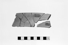 | Description: | Mended from nine fragments; one non-joining fragment. Straight vertical wall with one edge rounded, the other flat (evidently cut) with thin inner ridge. On both fragments remains of sharp cutting at one end. Faint traces of white slip. Very fine, hard, pinkish-reddish clay. | |