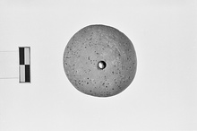 | Description: | Intact. Biconical, rounded form. Hole bored from either side. Clay 7. 5 YR 7/ 4. | |