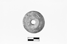 Conical form, with relatively large hole, flat at top and bottom. Traces of black paint and white slip preserved in places.
