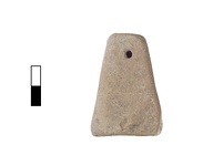 | Description: | Chipped around bottom edge. Pyramidal. Suspension round hole 0.009 from top. Faint traces of black glaze on underside. Hard orangish-pink fabric. | |