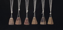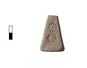 | Description: | Intact. Pyramidal, stamped. Flat top and bottom. Single suspension hole pierced near top. Stamped on four sides and top with star pattern. Two to three per side; one on top. No glaze. Orange fabric. | |