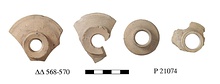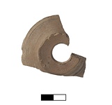 | Description: | Missing about two-thirds of rim and wall and part of central knob. Slightly conical support with plain rim. Pierced at center, with broad, flat area, inwardly beveled, surrounding hole. Hard, fine, somewhat micaceous fabric, light reddish brown (5 YR 6/4). A few fine dark inclusions. | |