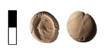 Thick oval token stamped on obverse, edge raised. Reverse round with finger prints.