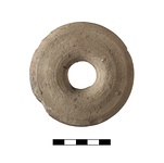 Round clay disc with large hole formed in center. Flat bottom recessed around hole. Convex on top with central ridge.