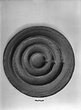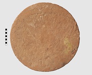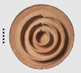 | Description: | The outer ridge is broken away. Flat bottomed round disk. On upper side, four concentric circular ridges, rising ca. 0.035 from the floor of the disk. Through the inner ridges doors are cut, forming a continuous straight passage from inside to outer ring. The outer ridge had no opening. Decoration of groups of parallel incision, as if made with a fork, on the sides of the ridges. Gritty micaceous red clay, slipped. | |