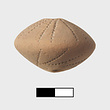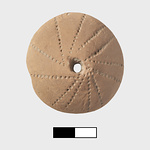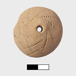 | Description: | Double convex. Pierced through the middle, slightly askew. Rows of stamped dots, forming diagonal spokes, on both sides. Unglazed. Attic clay. | |