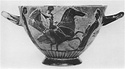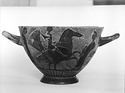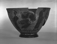 | Description: | Mended from many fragments, but complete save for a small piece from the lip, another from one side, and chips. Flaring ring foot, glazed above and decorated beneath with concentric circles of glaze. The handles are set ca. 0.02m. below the rim, and curve upwards slightly. Just above the attachment of the handles, the body contracts slightly, to flare again at the lip, giving a slightly offset effect; "cup-kotyle". Beneath one handle, a goose with raised wings; beneath the other, a cock(?) with head turned back over its shoulder. On either side, between the handles, appears a similar scene: a youth riding a hippalektryon, facing right. On each side of the rider is a standing draped figure looking toward him, their further hands held in front of the figure and covered with drapery. The riders wear short jerkins. Added purple is used for the head-bands with long pendent ends of the standing figures, for the caps of the riders, for the necks and rumps of the hippalektryons, for a stripe on the wings of each of the birds, and for the long garment of one of the spectators. Traces of added white remain on the jerkin of one of the riders, and on the outstretched drapery of the figure facing him. Incision careless and sparing. Inside black glazed. Buff clay. Good glaze somewhat lustrous; peeled on parts of the figures. Early Attic. | |