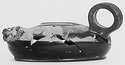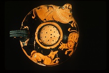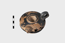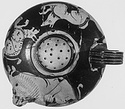 | Description: | Strainer top, depressed; flat bottom; the ring handle missing, and fragments of side and bottom. Restored in plaster. At right angles to the handle, a spout in the shape of a lion's head, the lion's body sketchily rendered in red figure. Also represented on the top, a seated dog and a griffin, facing each other. No relief contours. | |