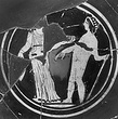 B) Similar; a nude youth holding a staff, and a cloaked male figure preserved. Double reserved ground line. Palmette and spirals at handles.