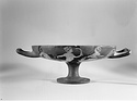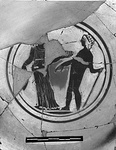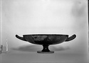 Description:   About two-thirds of rim and floor preserved, and one handle; none of the foot. Restored in plaster.