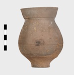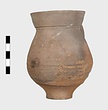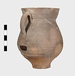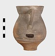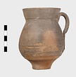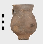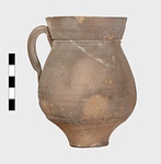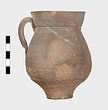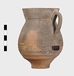 | Description: | Intact. Small flat bottom; wide mouth; flaring lip; thin small vertical handle. Light brown clay. Remains of dull dark glaze except toward the bottom. | |