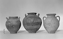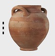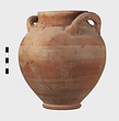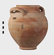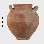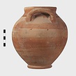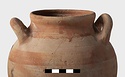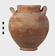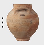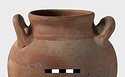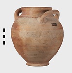 | Description: | Cracked, but intact save minor fractures. Low ring foot; wide mouth; two handles on shoulder. In handle zone, a wavy groove between horizontal grooves. Very dull reddish glaze on mouth, neck, tops of handles, and for broad bands on body. Brownish micaceous clay. Buff slip. | |