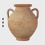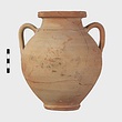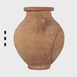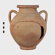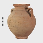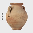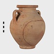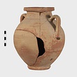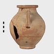 | Description: | Fragment of body missing; otherwise complete. Ring foot, with a groove around the outside; lip projecting, with grooves on vertical face; small handles roughly grooved. Reddish clay. Light buff slip. Coating of mastic on inside. Junction of neck and shoulder clearly visible. | |