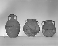 Description:   Mended from many pieces; three fragments missing from body. Ring foot formed by a continuation of wall; egg-shaped body; narrow neck; small projecting lip; band handles, from middle of neck to shoulder.