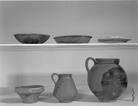 | Description: | Four joining fragments preserve complete profile. Open bowl with round-topped rim and very low ring foot. Circular hollow at center of floor. Clay dark buff with some mica (not typically "Samian"). Good solid red glaze. Samian A. | |