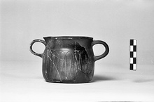 | Description: | About half of rim and walls, one handle and trace of attachment of the other preserved. Restored in plaster. Nearly vertical walls; slightly out-turned rim; vertical band handles. Light grooves around wall at junction with rim and at beginning of inturn toward base; between, petal ribbing. Glaze somewhat grayed and worn outside. Cf. P 6523. Note in tray a black glaze stemless cup, shallow, with offset lip, out-turned. | |