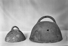 | Description: | Mended from many pieces. Restored in plaster. Deep domed cover with a basket handle on the top. Handmade of micaceous red clay. Buff slip, worn. Slightly blackened inside. | |