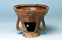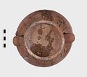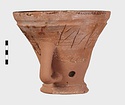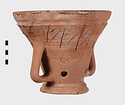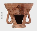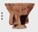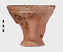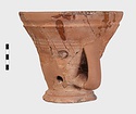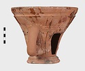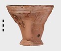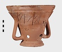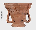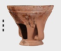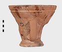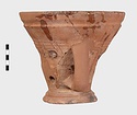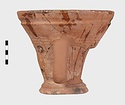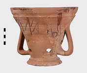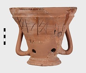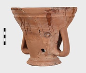 Description:   A small piece of the rim, parts of the base, and both handles, except for one lower attachment, missing. Deep inner bowl with moulded rim and flat bottom. High narrow base on concave foot, with a large rectangular opening on one side, and on the opposite side at least one small round hole. Two vertical handles attached at base of bowl and just above foot.
