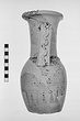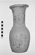 | Description: | Much of body and neck, one handle and all of base missing. Restored in plaster. Slender body; straight neck, outcurving rim with snakes in relief on it; one strap handle with snake, and snakes around shoulder. Glaze mostly gone. On preserved part of neck, to left of handle, a band of S scrolls; parts of four figures in panel below. Starting at right, two female figures holding palm branches facing left, then a male figure holding a lyre(?) facing them. Some object, perhaps a pointed amphora, between him and the last female figure. Behind the male, another female figure facing right holding palm branches. On shoulder, band of hooks; then a wider band, almost illegible, of vertical lines and waves; a horizontal band of lines and herringbone pattern and below this rays and another band of horizontal lines and herringbones. | |