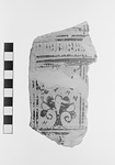 | Description: | With P 10656. Fragment of a stand, broken top and bottom. Panel framed by horizontal and vertical lines. Hanging palmette with alternating reserved and black leaves; below, the upper part of a cock to the right. Z's in the field. Heavy buff clay, fine buff slip. ADDENDA These two fragments are from the same stand, but not the same leg. Upper frag: head of cock to right. Lower frag: hind leg of quadruped(?) to right. I am not certain what the remaining bits of glaze represent [MEM 17.10.01]. | |