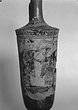 | Description: | Front with picture rotted and broken away; repaired, but parts missing. Semi-black figure technique. Warrior hastening from right is in silhouette with details partly in incision, partly in white paint. Women in center of left have faces drawn in outline. The central, smaller, female has white on flesh and ornamenting dress which is in thin glaze. Background, ivy branch. Above, maeander. On shoulder, rays. Cf. P 10318. | |