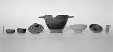 | Description: | Mended from many pieces. About half the rim missing. Underside, two circles around a dot. Above foot, rays. Ground reserved there and underneath, rubbed with red. Reserved also inside handles and just inside rim. Cf. Agora XII, no. 311. | |