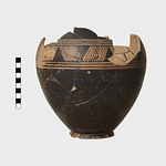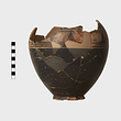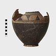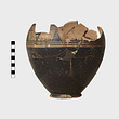 | Description: | No remains of handles. Fragments missing from walls. Decoration around point of greatest circumference, at turn of shoulder: groups of 10 to 13 parallel oblique lines sloping in alternating directions, so as to leave a triangle of black between each group. Above and below this zone, three narrow bands. Buff clay with bits. Firm glossy glaze. | |