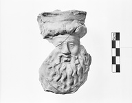 | Description: | From a situla. Broken all around. Most of face preserved, with heavy wreath around brows. Pinkish clay. Buff slip. | |