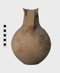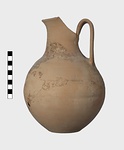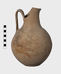 | Description: | Intact save for chip of lip and small hole in wall. Plump body, small flat bottom. Narrow neck with plain cutaway lip. Rising band handle, lip to shoulder. Fine pale buff clay. Middle Helladic. | |