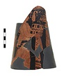 | Description: | Three fragments: a) From the lebes. Upper part of a female figure right. She wears thin chiton, embroidered head band and earring, and carries a large casket, ornamented with bosses and with a double row of egg and dot pattern, in her outstretched arms. An embroidered scarf falls over her right hand. Behind her, a bit of drapery; above, handle attachments, with tongues between. b) From the stand. Part of a woman, right, carrying a box; facing her, the hand of another figure holding a large plemochoe, a scarf over the hand. A small scarf in the field beween the two figures. Maeander above. c) From the stand. A cushioned stool, with an embroidered scarf falling in front of it; from the right, an extended right hand holding a mirror. Bit of drapery at extreme left. Some object in field above mirror. d) Fragment of flaring base, black; tongues above and part of a foot. e) From lower part, with tongues and foot left. f) From upper part, bit of drapery. A little relief contour on a), none on b) or c). Brown wash on the mirror; some brown shading on drapery. b) and c) put together with plaster. | |