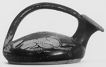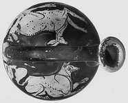 | Description: | Intact except for hole in bottom. Shallow type; spout set an an angle. Flat bottom. On the upper body, a dog and a rabbit (or deer?), both facing the spout. No relief contour. Glaze thin, somewhat worn; not reaching quite to bottom. | |