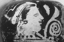 | Description: | Mouth broken off. Squat type. On front of body, head of woman right, facing a volute plant. She wears a broad head band, earrings and necklace. | |