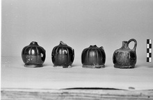 | Description: | Mouth, neck and handle broken off. Broadly spaced vertical grooves down body. Good black glaze. Cf. Agora XII, no. 1129. | |