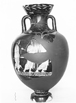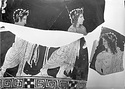 | Description: | Many fragments preserve most of the lip, both handles, the base and much of the wall. Restored in plaster. Panathenaic shape. Flaring echinus lip; small handles, below lip to shoulder; plain foot flat on top; ring around neck. Around outer face of lip, olive wreath, the leaves reserved, the berries white; two palmettes, vertically opposed, at each of the lower handle attachments. Below the figures, band of maeander broken by checkerboard squares. No trace of division into panels: side walls missing below shoulder. A) Procession of four(?) youths, moving right; parts of three preserved, space at the right for a fourth, missing. In the center, a slender tree with laurel-like leaves and white berries. The youths are wreathed, and, in so far as preserved, clad alike in full himatia variously draped. The first and second figures have long hair curling to their shoulder; of the third the top of the head only remains. The second figure looks back toward the first; between them is a shallow tray(?) which they appear to be carrying, held low. Inscribed over and just in front of the head of the first figure: <graphic>; of the third, ΧΡΣ[ B) The procession continues: three youths, right, similar to those on A, their hair respectively long and curly, short, and lanky. The figure at the left carries a large amphora on his shoulder, steadied by his right hand. He looks back to the left. Written from just above the amphora, the inscription: <graphic> Relief contour for profiles and napes; some brown details and drapery shading. White for the berries of the wreaths and presumably for the inscriptions, of which now only the stain remains. | |