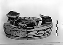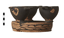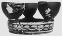 | Description: | Two fragments preserve nearly the complete circumference of the ring. Flat-bottomed hollow ring vase, rectangular in section, with a slightly projecting flat base and slightly convex outer side wall. On top, three small pots (broken off near their bottoms) connect with the inside of the ring by holes pierced through their floors. They stood fairly high as indicated by the feet and bottom of the skirt of a running female figure preserved on the outer face of one of them. On top of the ring, reserved blobs; on its outer face, a continuous olive wreath. No contours; glaze smeary; coarse work. | |