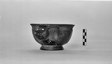 | Description: | Broken away immediately above moulded ring foot. Restored in plaster. At center of floor, grooved ring; around it, small deep-set linked palmettes surrounded by blobby depressions between groove-rings. Good black glaze. Underside reserved, with glazed circles and dot, and remains of miltos wash. | |