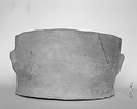 | Description: | Mended from a number of pieces; fragment of rim and side and another small bit of body missing. Flat bottom, slightly projecting; straight sides; two attached arching handles. Coarse clay and pinkish slip. No trace of burning. Fabric as P 10583 (Φ 460). The pot appears to have cracked across the bottom (in making?) and over the crack was smeared dark brown clay. | |