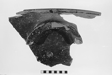 | Description: | Large fragment from wall of a glazed basin with huge curving lug handle. The handle thickened at its edge. Flat projecting rim. Metallic glaze, black to brown. | |