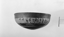 | Description: | Base, handles and many wall fragments are missing. A deep cup with slightly flaring lip. Interior: large, reserved medallion, its middle broken away; around the lip a reserved band. A broad handle band is figured: on either side between palmettes, a group of nine; in the middle a nude groom standing beside his horse, flanked on either side by three fully draped, erect, calm males and one agitated male with cloak only. Hasty incision; applied white and purple paint. | |