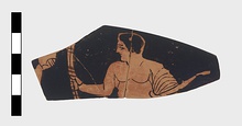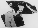 | Description: | a)Fragment from floor only. In the medallion, a long-sleeved figure to right, preserved from shoulder to thigh, its right side only. Relief contours. Around the medallion, a maeander broken by dotted checkerboard squares, the black parts formed by large round dots. On the exterior, parts of the handle palmettes and of the foot(?) of a figure standing on a single reserved line. No relief contours. b) Fragment with much of one handle and the top of the palmette ornament between. c),d),e) Three fragments from the exterior of a cup, probably but not certainly the same as a) and b). c) Rim fragment. Upper part of nude youth, left; a torch in his right hand, a cloak over his left arm, and a staff(?) in his left hand. From the left, the hand of another figure, holding out a kotyle towards him. d) Rim fragment. Nude youth right, holding out a kotyle in his left hand; at the right, the arm of a dancing figure. e) Wall fragment. Mid-part of a standing youth, a cloak falling down beside him at his left; probably from the figure seen on c). ADDENDA Painter of Heidelberg 211 (very near late painter of London E 777) (JDB letter Oct. 14, 1937). | |