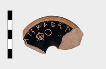 | Description: | Fragment from base of a cup. Incised on underside: <graphic> Black glazed above and below; the torus outer edge reserved. | |